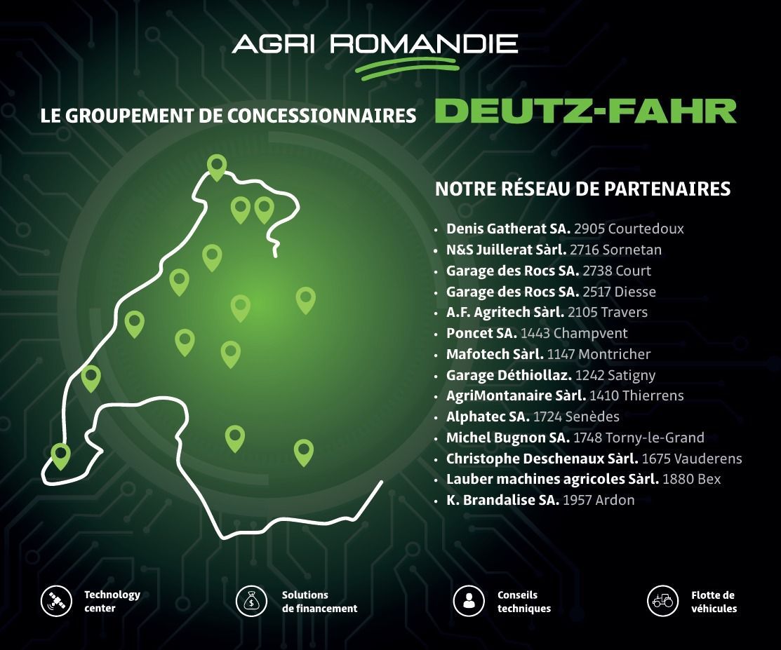 Agri-Romandie, c'est une nouvelle approche de la vente des tracteurs Deutz-Fahr en Suisse Romande. Neuf concessionnaires se sont alliés pour créer une nouvelle entreprise, dans le but de rester proches de leur clientèle tout en offrant un vaste choix de véhicules agricoles. Cette union incarne la force de la collaboration et de la proximité, avec pour unique objectif de répondre aux besoins des agriculteurs suisses romands. Agri Romandie est présent dans toute la suisse romande grâce à ses concessionnaires fondateurs et à ses partenaires.